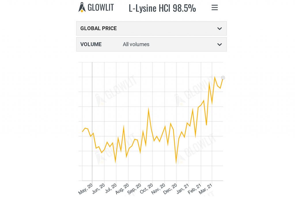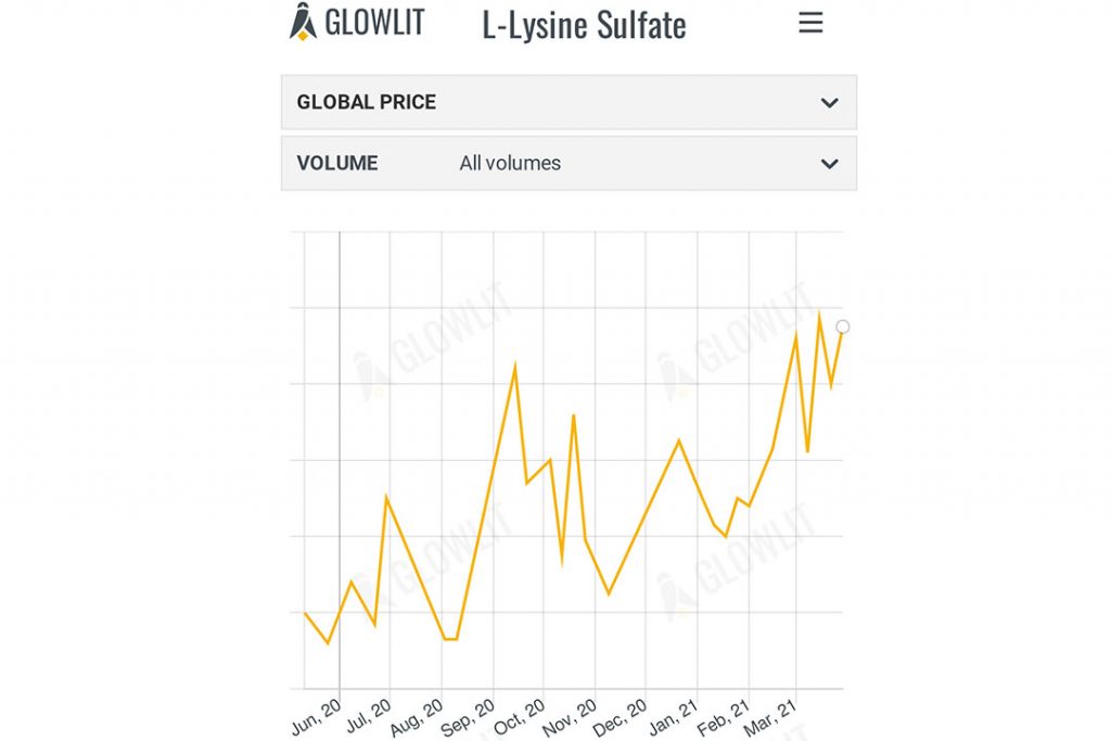 در حالی که قیمت هر دو محصول افزایش یافته است ، قیمت لیزین سولفات با در نظر گرفتن غلظت واقعی لیزین نسبتاً ارزان تر از لیزین HCl است. اگر به داده های منتشر شده جهانی نگاه کنیم، می بینیم که سولفات لیزین با محاسبه تفاوت غلظت ها، تقریباً ۲/۱۳ درصد از لیزین HCl ارزان تر است. این تفاوت ممکن است به اندازه کافی زیاد باشد تا مرغداران را مجبور به تجدید نظر در جیره های خود کند.