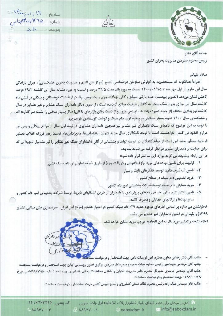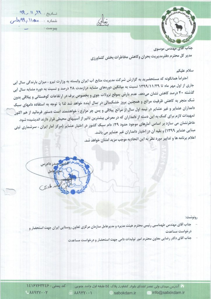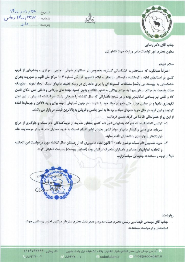 مکاتبه با دکتر رضایی معاونت محترم امور تولیدات دامی در خصوص خشکسالی
