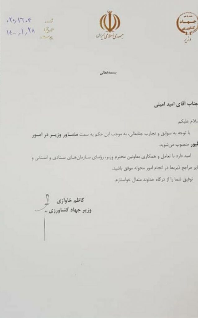 طی حکمی از سوی کاظم خاوازی؛ امید امینی بعنوان مشاور وزیر در امور طیور منصوب گردید.