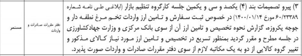 به گزارش پایگاه اطلاع رسانی کشاورزی ایران (اگنا)؛به نقل از خبرنگاران جوان،بر اساس تصمیمات یکصد و سی و چهارمین جلسه کارگروه تنظیم بازار در مورخ ۱۴۰۰/۱/۳۰ و پیرو تصمیمات بند ۴ یکصد و سی و یکمین جلسه کارگروه تنظیم بازار (ابلاغی طی نامه شماره ۶۰.۲۳۳۸۹ مورخ ۱۴۰۰.۱.۱۴) در خصوص ثبت سفارش و تأمین ارز واردات تخم مرغ نطفه دار و جوجه یکروزه گزارش نحوه تخصیص و تأمین ارز آن از سوی بانک مرکزی و وزارت جهار کشاورزی در جلسه مطرح و مقرر شد به منظور تسریع در تخصیص و تأمین ارز مورد نیاز کالای مذکور و تغییر گروه کالایی از دو به یک مکاتبه لازم از سوی دفتر مقررات صادرات و واردات صورت پذیرد.