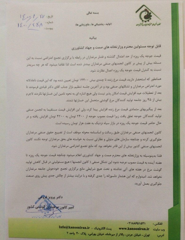 فلذا بدینوسیله به وزارتخانه های محترم صمت و جهاد کشاورزی اعلام می شود چنانچه قیمت جوجه یک روزه تا هفته آینده به قیمت مصوبه عرضه نشود این تشکل صنفی (کانون انجمن ها) هیچ مسئولیتی در قبال کاهش تولید گوشت مرغ در هفته های آتی نداشته و تحت هیچ شرایطی مانع برگزاری تجمع خودجوش جامعه مرغداران نخواهد شد. امیدوارم که این هشدار دلسوزانه را جدی گرفته و با درایت بیشتر از چالش جدی پیش روی صنعت جلوگیری به عمل آورید.