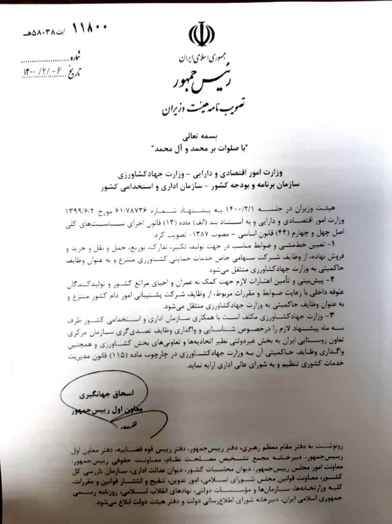 هیأت وزیران پیشنهاد وزارت اقتصاد در راستای اجرای قانون سیاستهای کلی اصل ۴۴ قانون اساسی درخصوص وظایف وزارت جهادکشاورزی را مصوب و ابلاغ کرد.