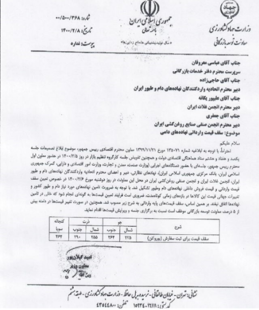با توجه به ابلاغیه شماره ۱۳۵۰۷۱ مورخ ۱۳۹۹/۱۱/۲۱ معاون اقتصادی رئیسجمهور، موضوع ابلاغ تصمیمات جلسه یکصد و هفتاد و هشتم ستاد هماهنگی اقتصادی دولت و همچنین تفویض جلسه کارگروه تنظیم بازار در روز ۱۴۰۰/۲/۵ در حضور معاون اول رئیسجمهور، جلسهای با حضور دستگاههای اجرایی (وزارت صنعت، معدن و تجارت، وزارت امور اقتصادی و دارایی، گمرک، جمهوری اسلامی ایران، بانک مرکزی جمهوری اسلامی ایران)، نهادهای نظارتی، دبیر و اعضای اتحادیه واردکنندگان نهادههای دام و طیور ایران، انجمن غلات ایران و انجمن صنفی روغنکشی ایران در محل این معاونت در روز دوشنبه مورخ ۱۴۰۰/۲/۶ در خصوص تعیین سقف قیمت وارداتی و قیمت فروش داخلی نهادههای دام و طیور تشکیل شد.