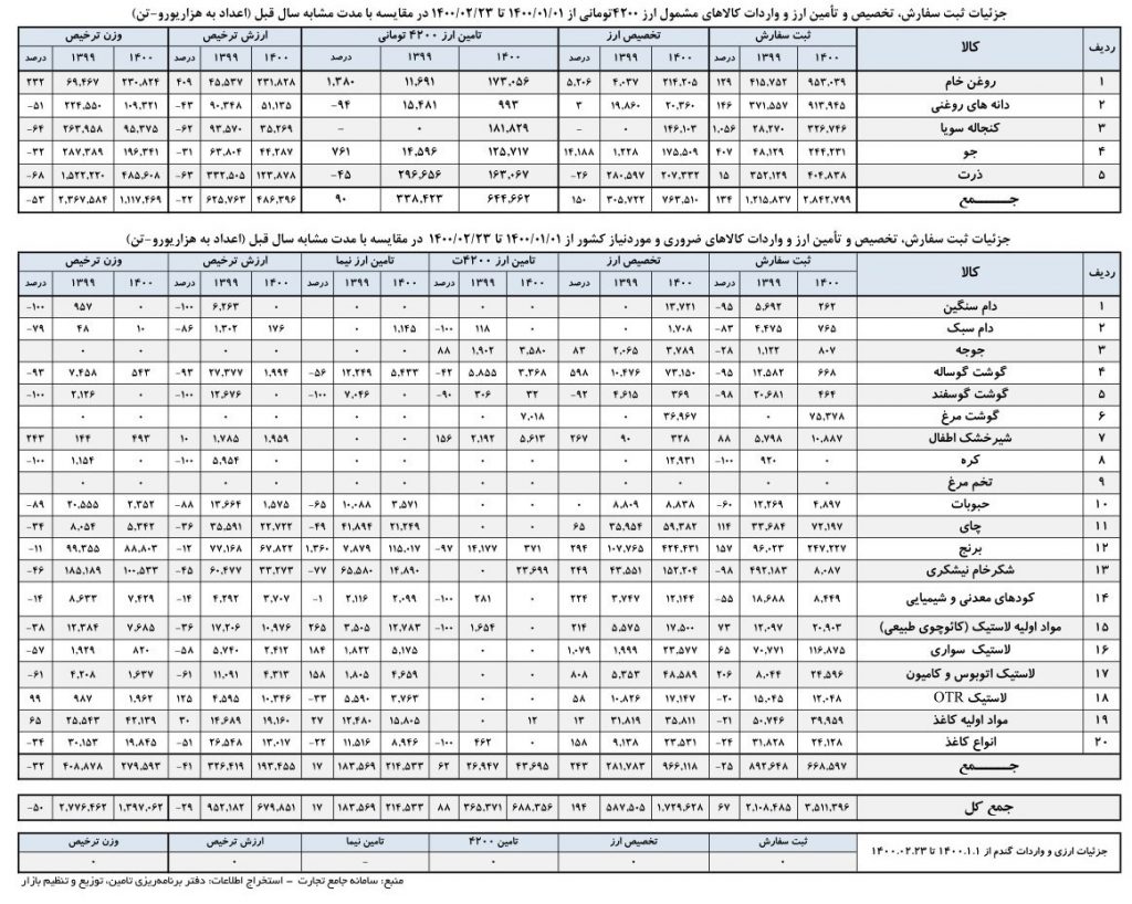 بررسی آمارهای موجود از ثبت سفارش، تخصیص ارز، تامین ارز و ارزش و وزن ترخیص کالاهای باقی مانده در گروه یک کالایی نشان میدهد، حدود ۲٫۸ میلیارد دلار ثبت سفارش انجام شده که تنها برای ۷۶۳ هزار دلار آن تخصیص صورت گرفته و ۶۴۴ هزار دلار نیز تامین ارز صورت گرفته است. بر این اساس درحالی که ثبت سفارش افزایش ۱۳۴ درصدی داشته اما تقریبا یک چهارم این ثبت سفارش به تامین ارز منتج شده است. این درحالی است که ارزش ترخیص اقلامی مثل روغن خام، دانه های روغنی کنجاله سویا، جو و ذرت از ۴۸۶ هزار دلار به ۶۲۵ هزار دلار و معادل ۲۲ درصد کاهش یافته است. همچنین وزن ترخیص از ۲ میلیون و ۳۶۷ هزار تن به ۱ میلیون ۱۱۷ هزار تن کاهش یافته است.