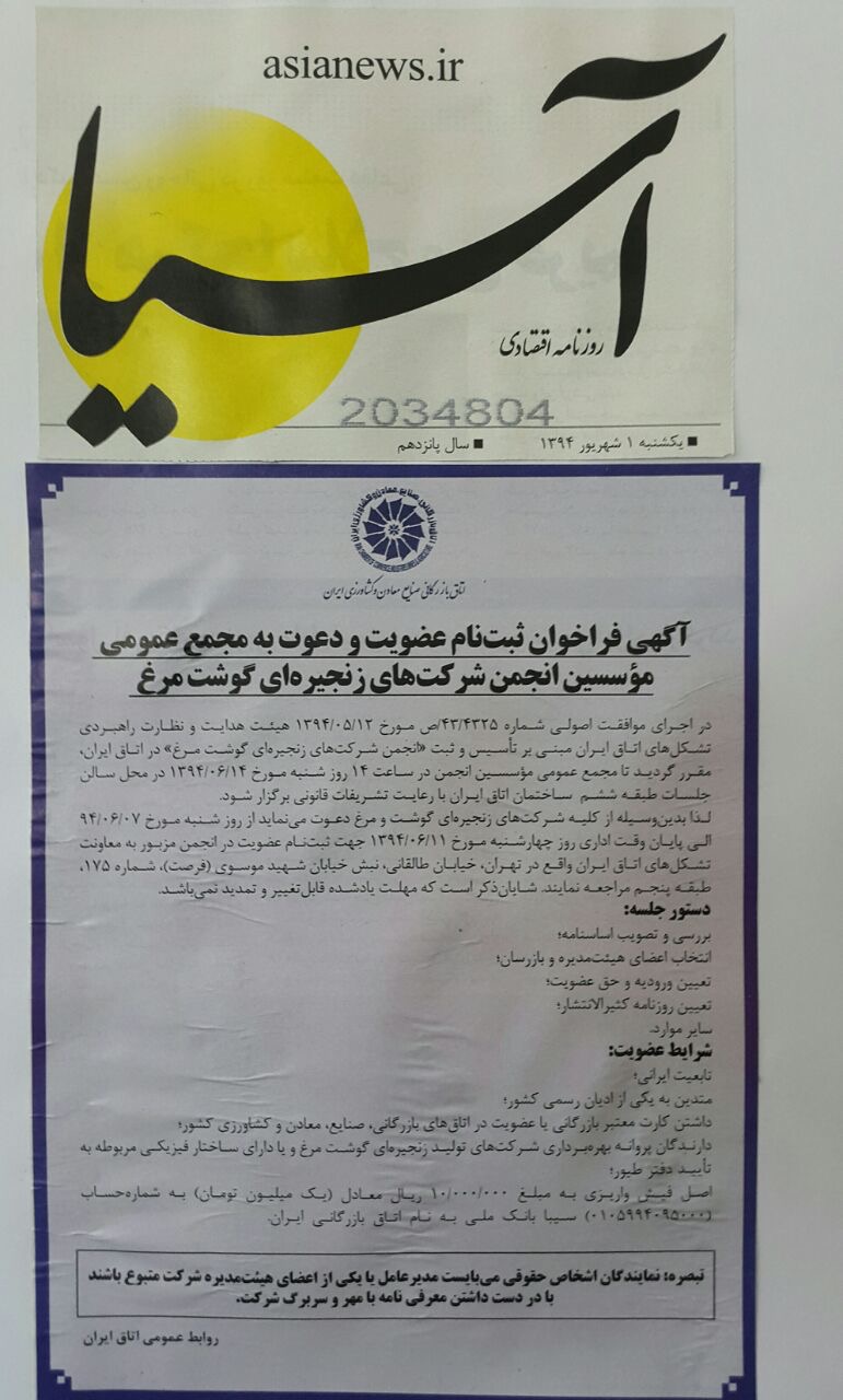 آگهي فراخوان ثبت نام عضويت و دعوت به مجمع عمومي موسسين انجمن شركت هاي زنجيره اي گوشت مرغ در يكي از روزنامه هاي كثير الانتشار منتشر شد.