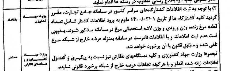 در مصوبه ستاد تنظیم بازار آمده است: با توجه به ثبت اطلاعات کشتارگاه های سراسر کشور در سامانه جامع تجارت، مقرر گردید کلیه کشتارگاه ها از تاریخ ۱۴۰۰٫۳٫۱ ملزم به ورود اطلاعات کشتار شامل تعداد، قطعه، مرغ زنده، وزن ورودی و وزن لاشه استحصال مرغ در سامانه مذکور شوند.