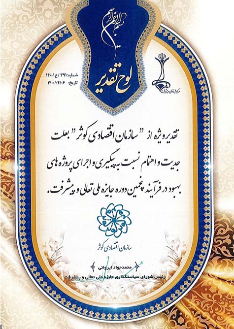 سازمان اقتصادی کوثر حائز تندیس بلورین و تقدیرنامه ۵ ستاره جایزه ملی تعالی و پیشرفت