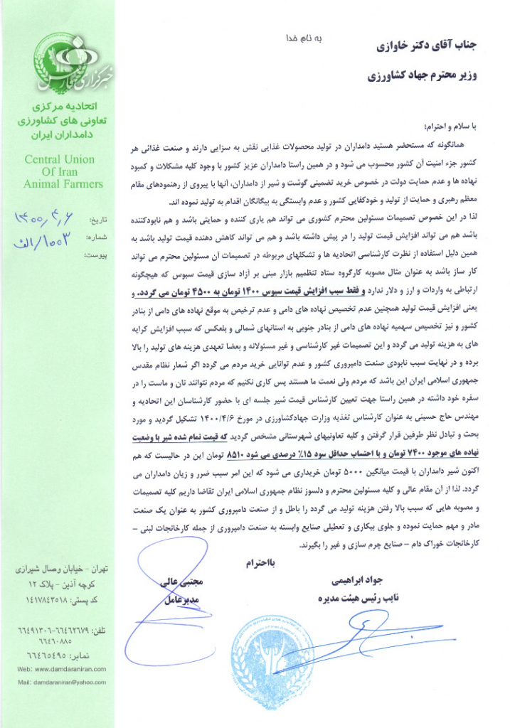 در این نامه نوشته شده است، پس از آزادسازی قیمت، نرخ سبوس از کیلویی ۱۴۰۰ تومان به کیلویی ۴۵۰۰ تومان افزایش یافته و در کنار قیمت بالای سایر نهاده ها، فشار بر تولید را افزایش داده است.