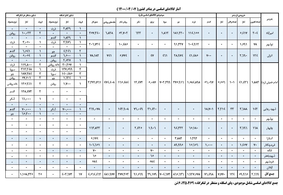 حدود ۴٫۵۶۴ میلیون تن کالای اساسی از قبیل گندم، ذرت، جو، روغن خام و دانههای روغنی در بنادر و گمرکات مختلف وجود دارد، بر این اساس تنها ۳٫۳ میلیون تن کالا در بندر امام خمینی(ره) موجود است، همچنین ۱۷ کشتی حامل ۴۰۳ هزار تن کالای اساسی شامل ذرت، گندم، دانههای روغنی و نهادههای دامی بهعلاوه شکر در حال تخلیه میباشند.