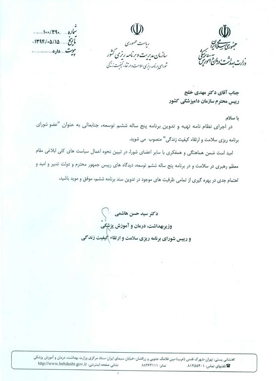 حسن قاضي زاده هاشمی، وزیر بهداشت، درمان و آموزش پزشکی و رییس شورای برنامه ریزی سلامت و ارتقاء کیفیت زندگی طی حکمی دکتر خلج را به عنوان عضو این شورا منصوب کرد.
