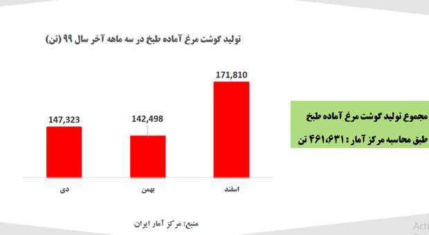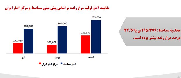 آمار ارائه شده از سوی مرکز آمار در زمینه تولید مرغ زنده در سه ماهه آخر سال ۱۳۹۹، حدود ۱۶۰ هزار تن کمتر از آنچه وزارت جهاد اعلام کرده بود، است