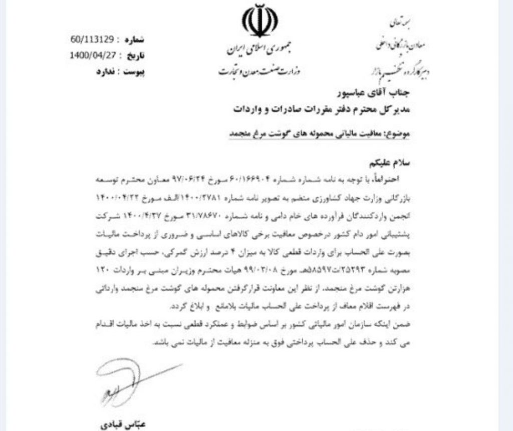در بخشی از این نامه آمده است؛ با توجه به نامه معاون توسعه بازرگانی وزارت جهادکشاورزی و انجمن واردکنندگان فرآوردههای خام دامی و نامه پشتیبانی امور دام کشور در خصوص معافیت مالیاتی برخی از کالاهای اساسی و ضروری از پرداخت مالیات به صورت الحساب برای واردات قطعی کالا به میزان ۴ درصد ارزش گمرکی، حسب اجرای دقیق مصوبه هیات وزیران مبنی بر واردات ۱۲۰ هزار تن گوشت مرغ منجمد از نظر این معاونت، قرار گرفتن محموله در فهرست اقلام معاف از پرداخت علیالحساب مالیات بلامانع و ابلاغ گردد.