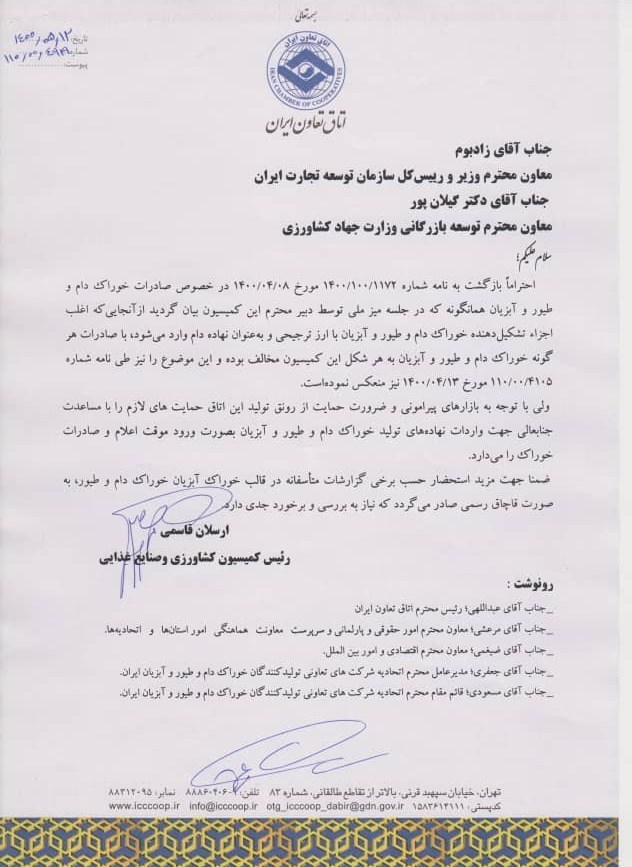 طبق نامه ی ارسلان قاسمی رئیس کمیسیون کشاورزی اتاق تعاون: