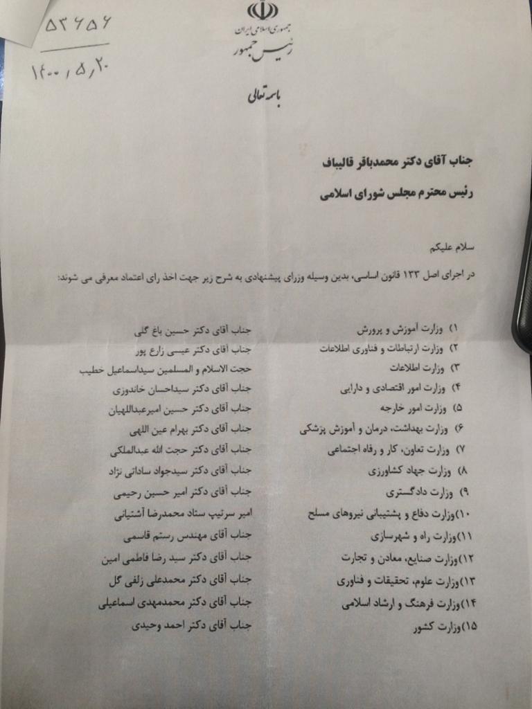 رییس جمهور لیست وزرای پیشنهادی را تقدیم مجلس کرد:
