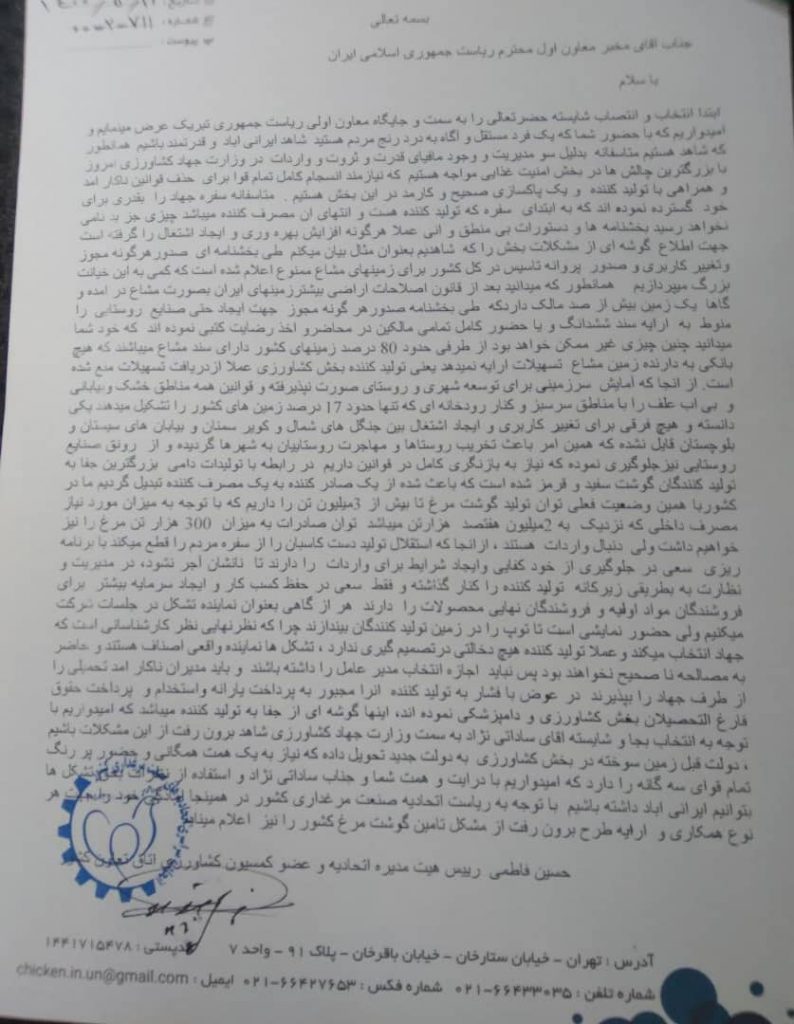 ابتدا انتخاب و انتصاب شایسته حضرتعالی را به سمت و جایگاه معاون اولی ریاست جمهوری تبریک عرض مینمایم و امیدواریم که با حضور شما که یک فرد مستقل و آگاه به درد رنج مردم هستید شاهد ایرانی اباد و قدرتمند باشیم همانطور که شاهد هستیم متاسفانه بدلیل سو مدیریت و وجود مافیای قدرت و ثروت و واردات در وزارت جهاد کشاورزی امروز با بزرگترین چالش ها در بخش امنیت غذایی مواجه هستیم که نیازمند انسجام کامل تمام قوا برای حذف قوانین ناکار امد و همراهی با تولید کننده و یک پاکسازی صحیح و کارمد در این بخش هستیم . متاسفانه سفره جهاد را بقدری برای خود گسترده نموده اند که به ابتدای سفره که تولید کننده هست و انتهای ان مصرف کننده میباشد چیزی جز بد نامی نخواهد رسید بخشنامه ها و دستورات بی منطق و انی عملا هرگونه افزایش بهره وری و ایجاد اشتغال را گرفته است جهت اطلاع گوشه ای از مشکلات بخش را که شاهدیم بعنوان مثال بیان میکنم طی بخشنامه ای صدورهرگونه مجوز وتغییر کاربری و صدور پروانه تاسیس در کل کشور برای زمینهای مشاع ممنوع اعلام شده است که کمی به این خیانت بزرگ میپردازیم