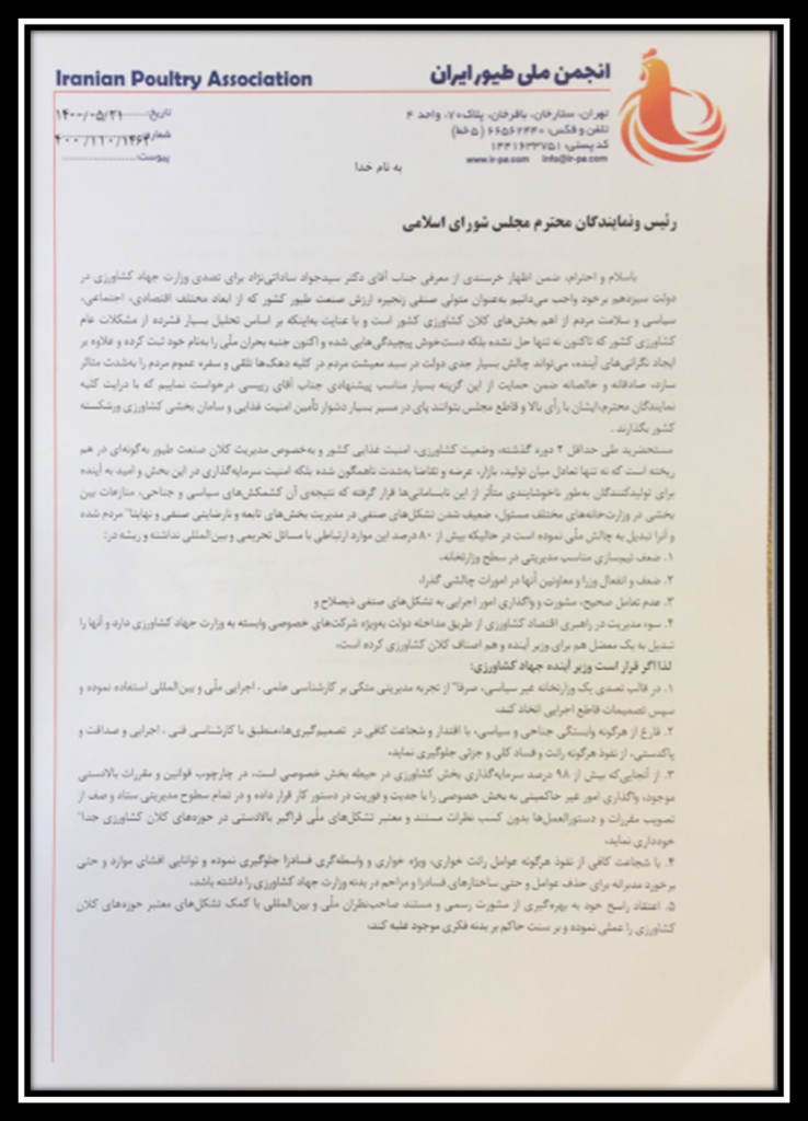 باسلام و احترام، ضمن اظهار خرسندی از معرفی جناب آقای دکتر سیدجواد ساداتینژاد برای تصدی وزارت جهاد کشاورزی در دولت سیزدهم برخود واجب میدانیم بهعنوان متولی صنفی زنجیره ارزش صنعت طیور کشور که از ابعاد مختلف اقتصادی، اجتماعی، سیاسی و سلامت مردم از اهم بخشهای کلان کشاورزی کشور است و با عنایت بهاینکه بر اساس تحلیل بسیار فشرده از مشکلات عام کشاورزی کشور که تاکنون نه تنها حل نشده بلکه دستخوش پیچیدگیهایی شده و اکنون جنبه بحران ملّی را بهنام خود ثبت کرده و علاوه بر ایجاد نگرانیهای آینده، میتواند چالش بسیار جدی دولت در سبد معیشت مردم در کلیه دهکها تلقی و سفره عموم مردم را بهشدت متاثر سازد، صادقانه و خالصانه ضمن حمایت از این گزینه بسیار مناسب پیشنهادی جناب آقای رییسی درخواست نماییم که با درایت کلیه نمایندگان محترم،ایشان با رأی بالا و قاطع مجلس بتوانند پای در مسیر بسیار دشوار تأمین امنیت غذایی و سامان بخشی کشاورزی ورشکسته کشور بگذارند .