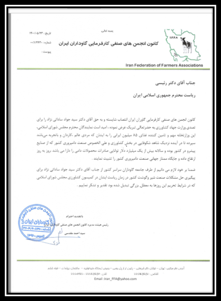 ضمناً بر خود لازم میدانیم از طرف جامعه گاوداران سراسر کشور از جناب آقای دکتر سیدجواد ساداتینژاد برای پیگیری حل مشکلات صنعت شیر و گوشت کشور در زمان ریاست ایشان در کمیسیون کشاورزی مجلس شورای اسلامی که در شرایط تحریم این روزها به معضل بزرگی تبدیل شده بود، تقدیر و تشکر نماییم.