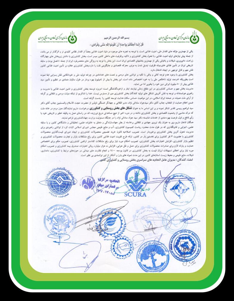 ما به عنوان تشکلهای روستایی وکشاورزی تحت پوشش سازمان مرکزی تعاون روستایی ایران ضمن تقدیر از آیت الله سید ابراهیم رئیسی درخواست داریم نمایندگان معزز مردم در خانه ملت که درک مناسبی از وضعیت اقتصادی و بخش کشاورزی داشته و در دوره اخیر از هیچ مساعدتی دریغ نورزیدهاند، در راستای عمل به وظیفه خطیر و تاریخی خود با رای قاطع و اول، فرصت بهرهمندی از خدمات شایسته دکتر سید جواد ساداتینژاد را در جایگاه مسئولیت وزارت جهاد کشاورزی فراهم نمایند.