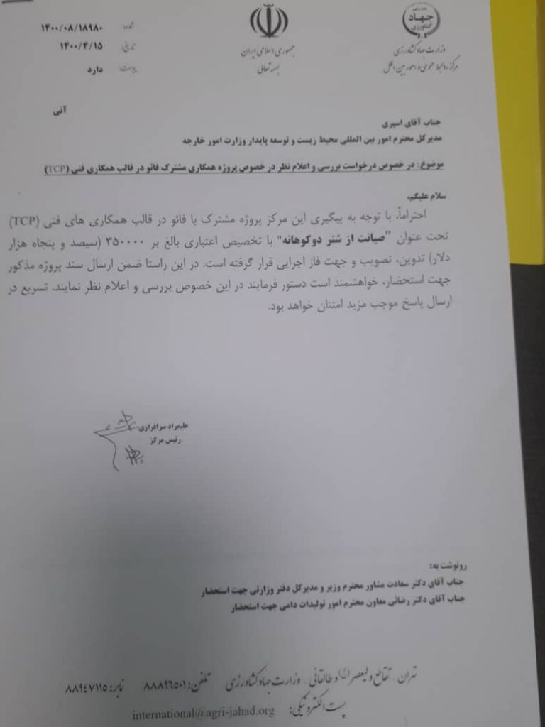 احتراماً، با توجه به پیگیری این مرکز پروژه مشترک با فائو در قالب همکاریهای فنی (TCP) تحت عنوان «صیانت از شتر دوکوهانه» با تخصیص اعتباری بالغ بر ۳۵۰٫۰۰۰ (سیصدوپنجاههزار دلار) تدوین، تصویب و جهت فاز اجرایی قرار گرفته است. در این راستا، ضمن ارسال سند پروژه مذکور جهت استحضار، خواهشمند است دستور فرمایند در این خصوص بررسی و اعلام نظر نمایند. تسریع در ارسال پاسخ موجب مزید امتنان خواهد بود.