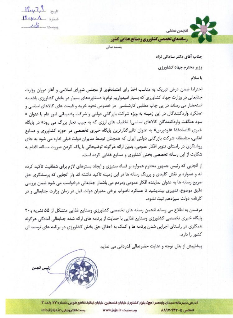 انجمن رسانههای تخصصی کشاورزی و صنایع غذایی با ارسال نامه سرگشادهای به وزیر جهادکشاورزی خواستار شد: