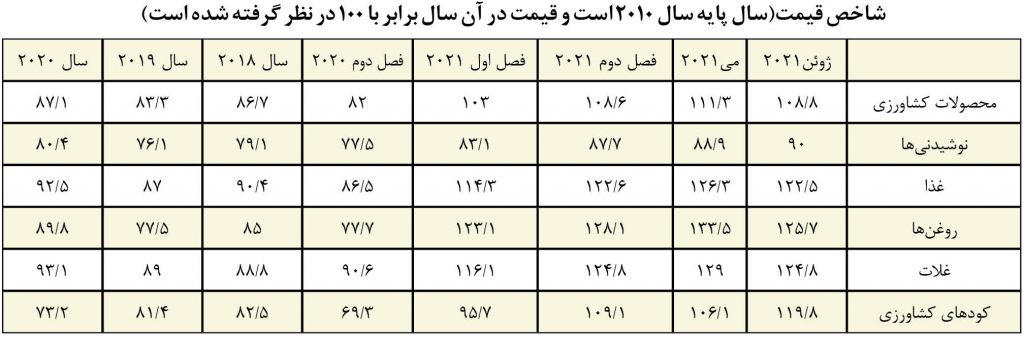 بانک جهانی هرماه گزارشی در مورد وضعیت بازار محصولات مهم کشاورزی ارایه میدهد که تصویری از وضعیت بازار در ماهی که گذشت و شرایط در ماههای قبل از ان را به تصویر میکشد. بررسی این گزارشها میتواند تصویر درستی از نحوه تغییر قیمت کالاهای اساسی کشاورزی در دنیا ارایه دهد. بههمین دلیل بر آن شدیم هر ماه خلاصهای از گزارش ارایه شده توسط بانک جهانی را در اختیار خوانندگان نشریه قرار دهیم.طبق گزارش ارایه شده در اوایل ماه جولای سال ۲۰۲۱ میلادی، شاخص قیمت محصولات کشاورزی در ماه ژوئن برابر با ۱۰۸٫۸ بود. این شاخص که نسبت به وضعیت قیمت محصولات کشاورزی در سال ۲۰۱۰ تهیه شده است، نشان میدهد قیمت محصولات کشاورزی در ششمین ماه سال جاری میلادی ۸٫۸ درصد بالاتر از سال ۲۰۱۰ بود. مقایسه این شاخص با شاخص ارایه شده در ماه «می» نشان دهنده کاهش نسبی قیمتها است در حالیکه در مقایسه با ماه آوریل قیمتها با افزایش همراه بود.شاخص قیمت محصولات کشاورزی در فصل دوم سال جاری برابر با ۱۰۸٫۶ بود در حالیکه همین شاخص در فصل دوم سال ۲۰۲۰ به ۸۲ رسید. شاخص ۸۲ در فصل دوم سال ۲۰۲۰ نشان میداد قیمتها در فصل دوم سال ۲۰۲۰ میلادی ۱۸ درصد پایینتر از سال قبل از آن بود. در ششمین ماه سال جاری شخص قیمت غلات در دنیا برابر با ۱۲۴٫۸ بود که معادل این شاخص در فصل دوم امسال هم بود ولی مقایسه ان با مدت مشابه سال قبل حکایت از افزایش قیمتها دارد. در فصل دوم سال قبل شاخص قیمت غلات در دنیا برابر با ۸۹٫۹ بود.