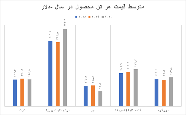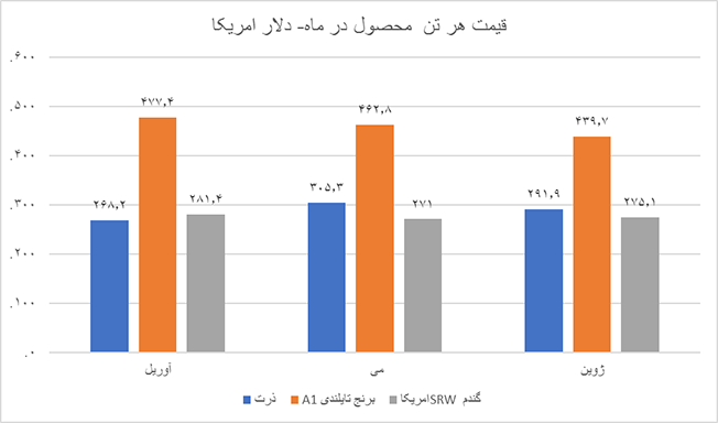 در ماه ژوئن سال جاری هر تن برنج تایلندی A1 با قیمت ۴۳۹٫۷ دلار فروخته شد که نسبت به ماه قبل از آن با کاهش همراه بود. در ماه «می» امسال هر تن برنج قیمتی برابر با ۴۶۲٫۸ دلار داشت و در ماه اوریل هر تن برنج با قیمت ۴۷۷٫۴ دلار فروخته شده بود. در فصل دوم سال ۲۰۲۱ هر تن برنج تایلندی قیمتی برابر با ۴۵۹٫۹ دلار داشت در حالیکه در فصل اول امسال با قیمت ۵۱۷٫۶ دلار فروخته شده بود. در فصل دوم سال ۲۰۲۰ هر تن برنج به ترتیب با قیمت ۵۱۰٫۱ دلار فروخته شد. متوسط قیمت هر تن برنج تایلندی A1 در سال ۲۰۱۸ برابر با ۴۰۱٫۱ دلار، در سال ۲۰۱۹ برابر با ۳۹۳٫۵ دلار و در سال ۲۰۲۰ برابر با ۴۷۴٫۶ دلار بود. بررسی روند تغییرات قیمت گندم SRW آمریکا در ماه ژوئن به ۲۷۵٫۱ دلار رسید که نسبت به ماه قبل از آن کمتر از ۴ دلار رشد کرده بود ولی در ماه اوریل امسال هر تن از این نوع گندم قیمتی برابر با ۲۸۱٫۴ دلار داشت. در فصل اول سال جاری هر تن گندم با قیمت ۲۷۵٫۲ دلار و در فصل دوم با قیمت ۲۷۵٫۸ دلار مبادله شد که بازهم نشان از افزایش چشمگیر نسبت به سال قبل از آن دارد. در فصل دوم سال ۲۰۲۰ هر تن گندم آمریکایی قیمتی برابر با ۲۱۰٫۷ دلار داشت و در فصل سوم با قیمت ۲۱۳٫۸ دلار فروخته شده بود. در سال ۲۰۱۸ هر تن گندم با قیمت ۲۰۳٫۹ دلار، در سال ۲۰۱۹ با قیمت ۲۱۱٫۳ دلار و در سال ۲۰۲۰ با قیمت ۲۲۷٫۷ دلار مبادله شده است.