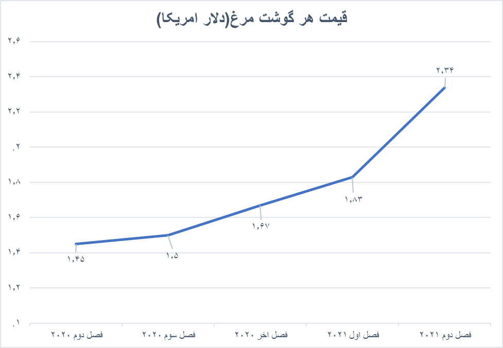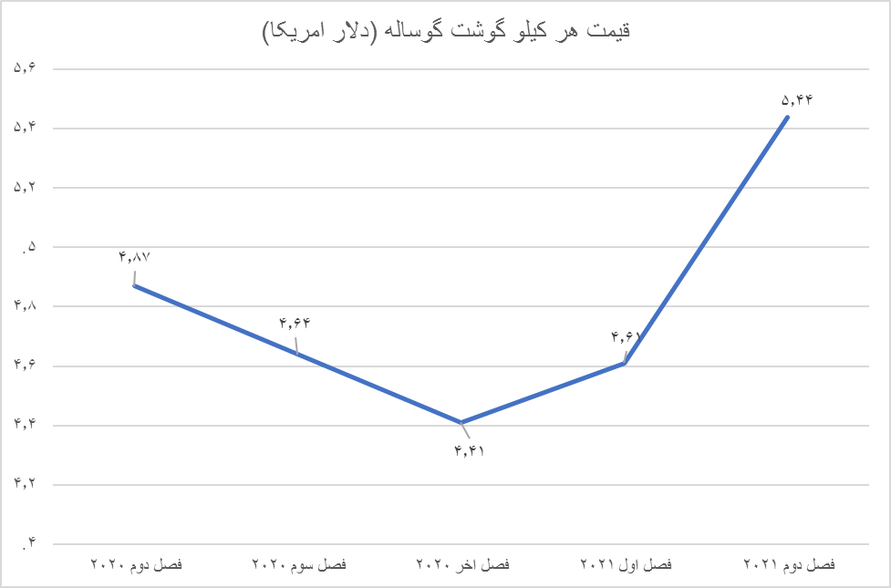 قیمت هر کیلو گوشت گوساله در ماه ژوئن برابر با ۵٫۶۸ دلار بود که نسبت به ماه قبل از آن ۲۰ سنت رشد کرده بود. در ماه «می» هر کیلو گوشت گوساله قیمتی برابر با ۵٫۴۸ دلار و در ماه آوریل قیمتی معادل ۵٫۱۷ دلار داشت. در سال ۲۰۱۸ هر کیلو گوشت گوساله با قیمت۴٫۲۰ دلار فروخته شد، در سال ۲۰۱۹ به ۴٫۷۶ دلار رسید و در سال ۲۰۲۰ در مرز ۴٫۶۷ دلار قرار گرفت. قیمت گوشت مرغ در ماههای اخیر در مرز ۲٫۳۸ دلار قرار داشت. آمارها نشان میدهد در سال ۲۰۱۸ هر کیلو گوشت مرغ قیمتی برابر با ۲٫۲۴ دلار داشت که در سال ۲۰۱۹ به ۲ دلار و در سال ۲۰۲۰ به ۱٫۶۳ دلار رسید. در فصل دوم سال ۲۰۲۰ و در اوج بحران کرونا در دنیا هر کیلو گوشت مرغ با قیمت۱٫۴۵ دلار مبادله شد، در فصل سوم به ۱٫۵ دلار و در فصل چهارم به ۱٫۶۷ دلار رسید. سرعت افزایش قیمت گوشت مرغ در دنیا در سال ۲۰۲۱ بالاتر بود و از ۱٫۸۳ دلار در فصل اول امسال به ۲٫۳۴ دلار در فصل دوم رسید.