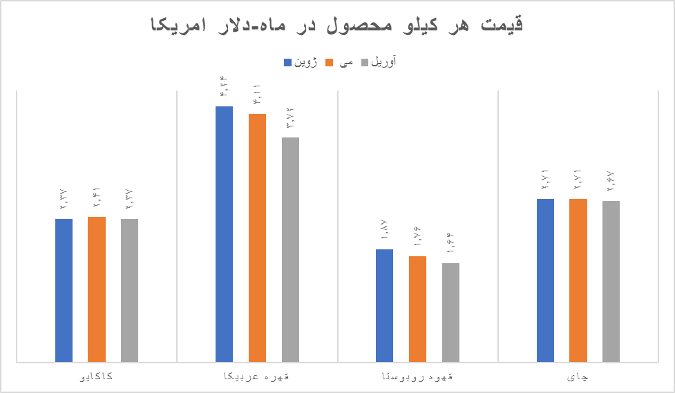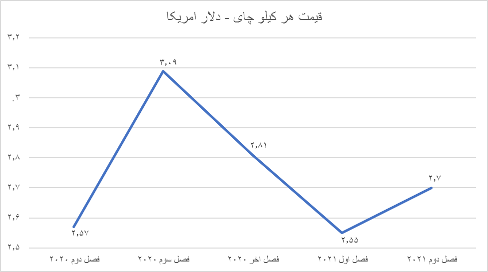 به ۴٫۰۲ دلار رسید. در این گزارش ضمن اینکه قیمت چای «کولومبو»، «کلکته» و«مومباسا» ارایه شده است، متوسط قیمت چای در بازار جهانی هم دیده میشود. گزارش نشان میدهد هر کیلو چای در ماه ژوئن امسال با قیمت۲٫۷۱ دلار مبادله شد که در دو ماه قبل هم از در همین سطح بود. متوسط قیمت هر کیلو چای در فصل دوم امسال برابر با ۲٫۷۰ دلار و در فصل اول برابر با ۲٫۵۵ دلار اعلام شد. در سال ۲۰۱۸ هر کیلو چای در دنیا قیمتی برابر با ۲٫۸۵ دلار داشت و در سال ۲۰۱۹ به ۲٫۵۶ رسید ولی در سال ۲۰۲۰ بازهم افزایش یافت و در مرز ۲٫۷۰ دلار قرار گرفت.