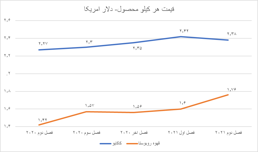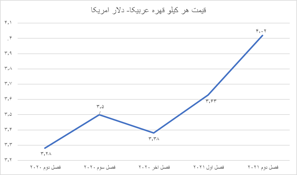 قیمت قهوه عربیکا در ششمین ماه سال جاری برابر با ۴٫۲۴ دلار و در قیمت هر کیلو قهوه «روبوستا» در بازار برابر با ۱٫۸۷ دلار بود. قیمت قهوه عربیکا در سه سال اخیر با رشد زیادی همراه بود ولی قیمت قهوه «روبوستا» نوسان زیادی نداشت. در سال ۲۰۱۸ هر کیلو عربیکا با قیمت۲٫۹۳دلار مبادله شد و در سال ۲۰۱۹ به ۲٫۸۸ دلار رسید. در سال ۲۰۲۰ هرکیلو قهوه به ۳٫۳۲ دلار رسید. در فصل اول امسال هر کیلو قهره عربیکا قیمتی برابر با ۳٫۶۳ دلار داشت و در فصل دوم