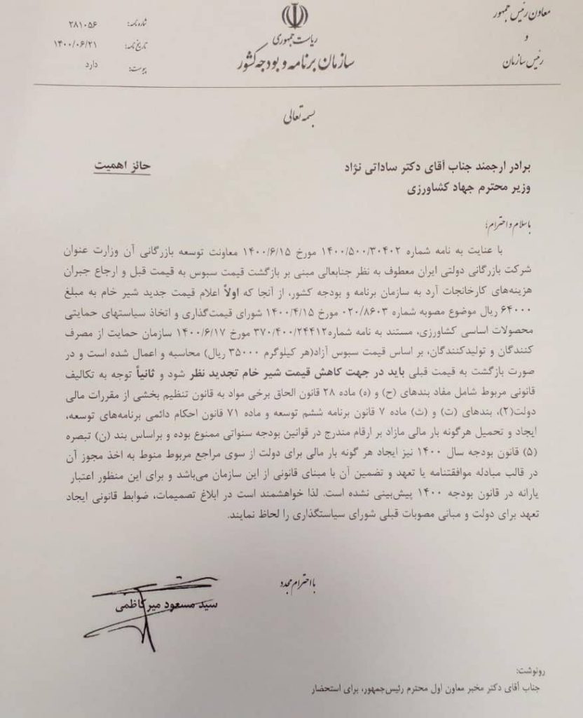 با عنایت به نامه شماره ۱۴۰۰/۵۰۰/۳۰۴۰۲ مورخ ۱۵.۶.۱۴۰۰ معاونت توسعه بازرگانی آن وزارت عنوان شرکت بازرگانی دولتی ایران معطوف به نظر جنابعالی مبنی بر بازگشت قیمت سبوس به قیمت قبل و ارجاع جبران هزینههای کارخانجات آرد به سازمان برنامه و بودجه کشور، از آنجا که اولاً اعلام قیمت جدید شیر خام به مبلغ ۶۴,۰۰۰ ریال موضوع مصوبه شماره ۲۰/۸۶۰۳ مورخ ۱۵.۴.۱۴۰۰ شورای قیمت گذاری و اتخاذ سیاستهای حمایتی محصولات اساسی کشاورزی، مستند به نامه شماره ۳۷۰/۴۰۰/۲۴۴۱۲ مورخ ۱۷.۶.۱۴۰۰ سازمان حمایت از مصرف کنندگان و تولید کنندگان، بر اساس قیمت سبوس آزاد (هر کیلوگرم ۳۵۰۰۰ ریال) محاسبه و اعمال شده است و در صورت بازگشت به قیمت قبلی باید در جهت کاهش قیمت شیر خام تجدید نظر شود و ثانیاً توجه به تکالیف قانونی مربوط شامل مفاد بندهای (ح) و (ه) ماده ۲۸ قانون الحاق برخی مواد به قانون تنظیم بخشی از مقررات مالی دولت (۲)، بندهای (ت) و (ث) ماده ۷ قانون برنامه ششم توسعه و ماده ۷۱ قانون احکام دائمی برنامههای توسعه ایجاد و تحمیل هر گونه بار مالی مازاد بر ارقام مندرج در قوانین بودجه سنواتی ممنوع بوده و بر اساس بند (ن) تبصره (۵) قانون بودجه سال ۱۴۰۰ نیز ایجاد هر گونه بار مالی برای دولت از سوی مراجع مربوط منوط به اخذ مجوز آن در قالب مبادله موافقتنامه یا تعهد و تضمین آن با مبنای قانونی از این سازمان میباشد و برای این منظور اعتبار یارانه در قانون بودجه ۱۴۰۰ پیش بینی نشده است.