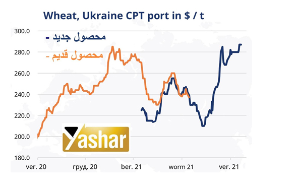 در نمودار اول، روند سه ماهه قیمت گندم تحویل ترمینال ها در اکراین را از سپتامبر سال ٢٠٢٠ تا ٢٠٢١، بررسى میکنیم.