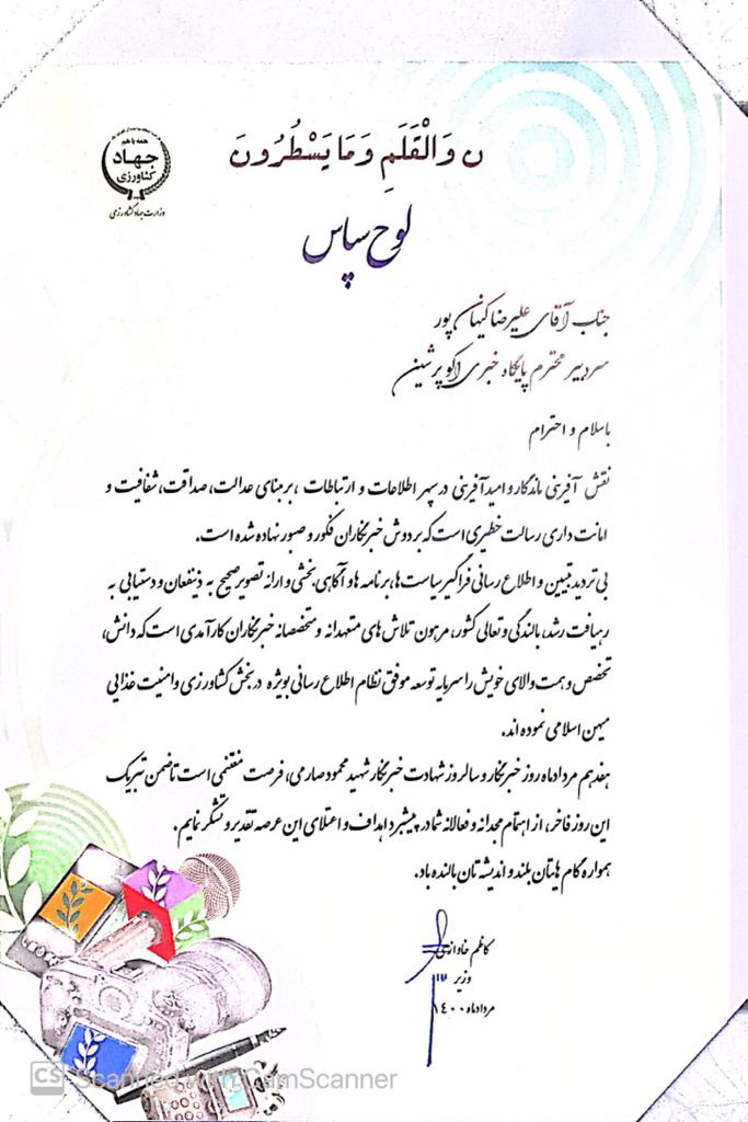 اما جنتلمنی و شخصیت والای وزیر سابق بخش کشاورزی جناب آقای دکتر کاظم خاوازی که در مساله مشکلات دام وطیور بیشترین مقالات ویادداشت انتقادی اما محترمانه و همراه با پیشنهادات را تقدیم ایشان کردم در روزهای پایانی وزارتی خود با اهدای لوح تقدیر در واقع از دیدگاه فاخر و انتقاد پذیر خودش رونمایی واز نگارنده سپاسگزاری کرد که هرگز فراموش نخواهد شد و آموزه های اخلاقی و رفتاری دکتر خاوازی در عمل به منصه ظهور و حضور به زیبایی رقم خورد و ثبت تاریخی شد.