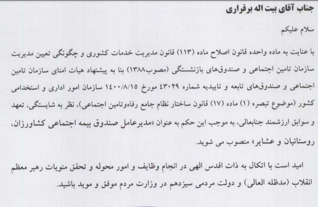 انتصاب مدیرعامل صندوق بیمه اجتماعی کشاورزان، روستاییان و عشایر