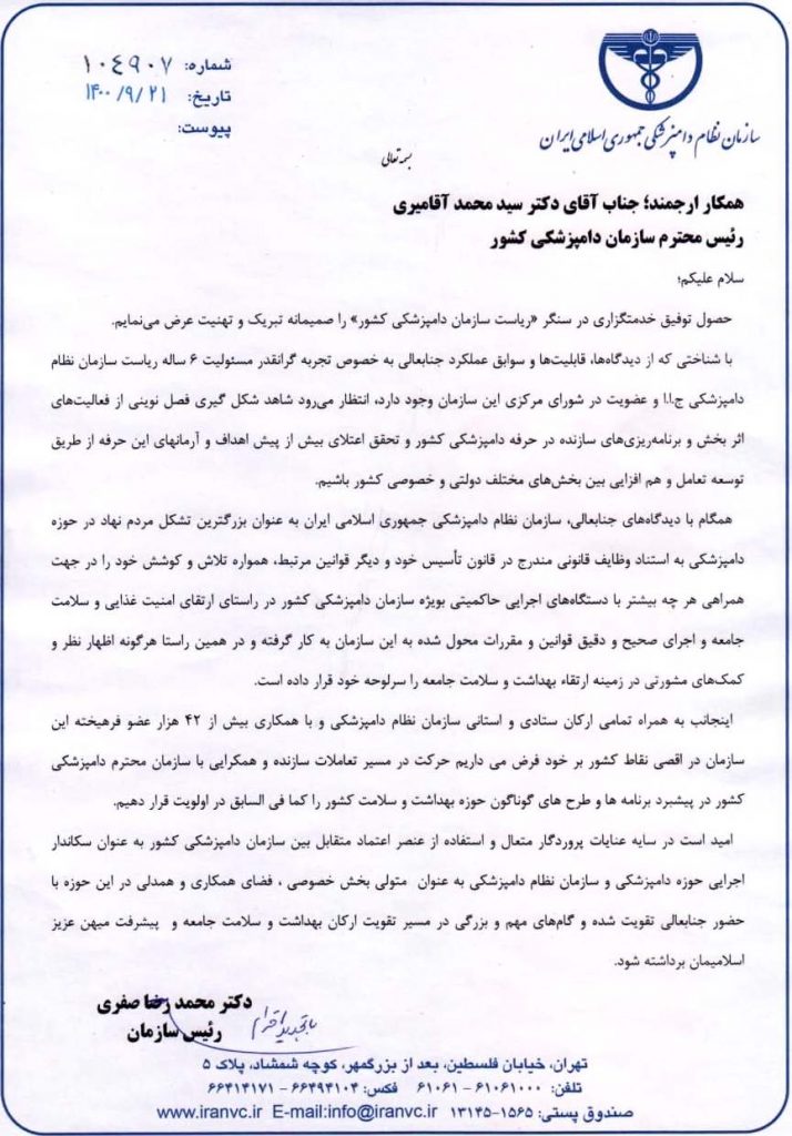 اینجانب به همراه تمامی ارکان ستادی و استانی سازمان نظام دامپزشکی و با همکاری بیش از ۴۲ هزار عضو فرهیخته این سازمان در اقصی نقاط کشور بر خود فرض می داریم حرکت در مسیر تعاملات سازنده و همکرایی با سازمان محترم دامپزشکی کشور در پیشبرد برنامه ها و طرح های گوناگون حوزه بهداشت و سلامت کشور را کما فی السابق در اولویت قرار دهیم.