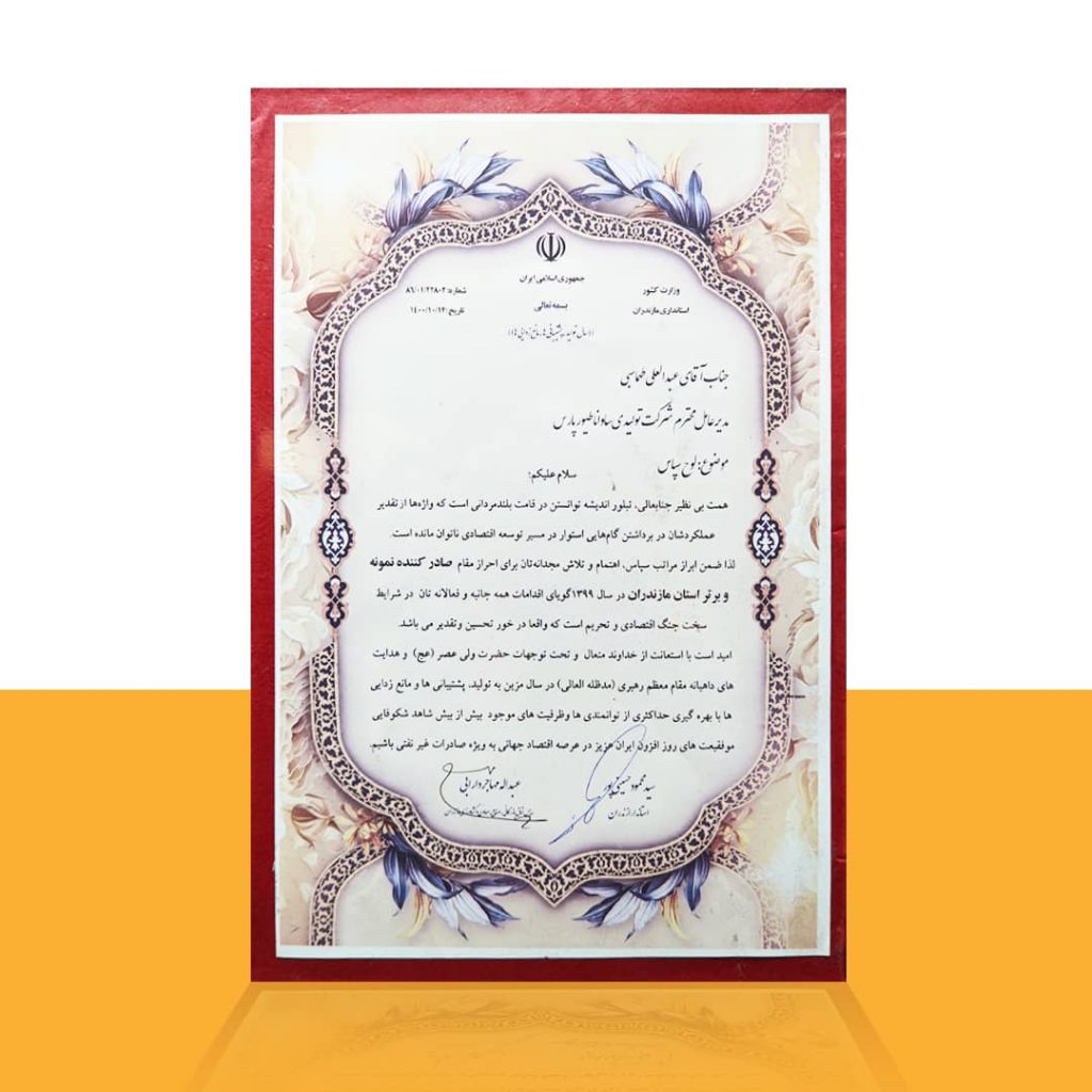 لذا، ضمن ابراز مراتب سپاس، اهتمام و تلاش مجدانهاتان برای احراز مقام صادرکننده نمونه و برتر استان مازندران در سال ۱۳۹۹گویای اقدامات همهجانبه و فعالانهاتان در شرایط سخت جنگ اقتصادی و تحریم است که واقعاً در خور تحسین و تقدیر میباشد.