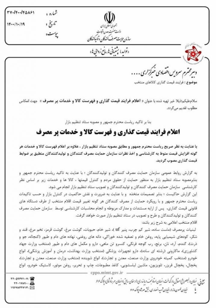 به گزارش پایگاه اطلاع رسانی کشاورزی ایران (اگنا)، به نقل از روابط عمومی سازمان حمایت مصرف کنندگان و تولیدکنندگان، بنابر تصمیمات متخذه و با عنایت به ضرورت و نقش حاکمیت در کنترل بازار و حسب تاکیدات ریاست محترم جمهور و با رویکرد حمایت از مصرف کنندگان هر گونه تغییر قیمت اقلام منتخب از طرف دستگاه های قانونی قیمت گذاری، پس از ارایه مستندات و مدارک مربوطه و انجام محاسبات کارشناسی توسط سازمان حمایت مصرف کنندگان و تولیدکنندگان و طرح و تصویب در ستاد تنظیم بازار صورت خواهد گرفت.