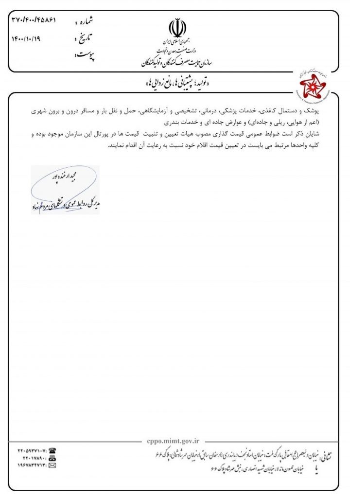 شایان ذکر است ضوابط عمومی قیمت گذاری مصوب هیات تعیین و تثبیت قیمت ها در پورتال این سازمان موجود بوده و کلیه واحدها مرتبط می بایست در تعیین قیمت اقلام خود نسبت به رعایت آن اقدام نمایند.