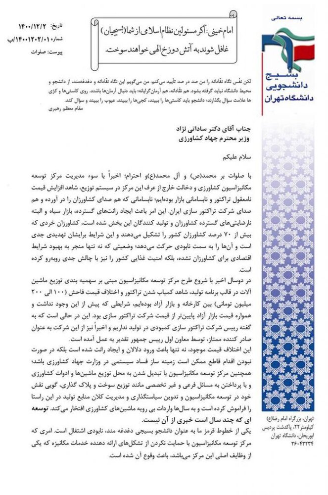 بسیج دانشجویی دانشگاه تهران در نامهای خطاب به سیدجواد ساداتینژاد، وزیر جهاد کشاورزی، ضمن گله از نابهسامانی وضعیت توزیع مکانیزاسیون کشاورزی در کشور، سوءمدیریت مرکز توسعه مکانیزاسیون وزارت جهاد را عامل این امر دانست و این وضعیت را تهدیدی برای امنیت غذایی کشور اعلام کرد.