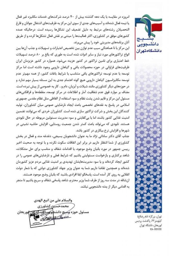 به گزارش پایگاه اطلاع رسانی کشاورزی و صنایع غذایی ایران(اگنا)، متن نامه بسیج دانشجویی دانشگاه تهران خطاب به وزیر جهاد کشاورزی به شرح ذیل است: