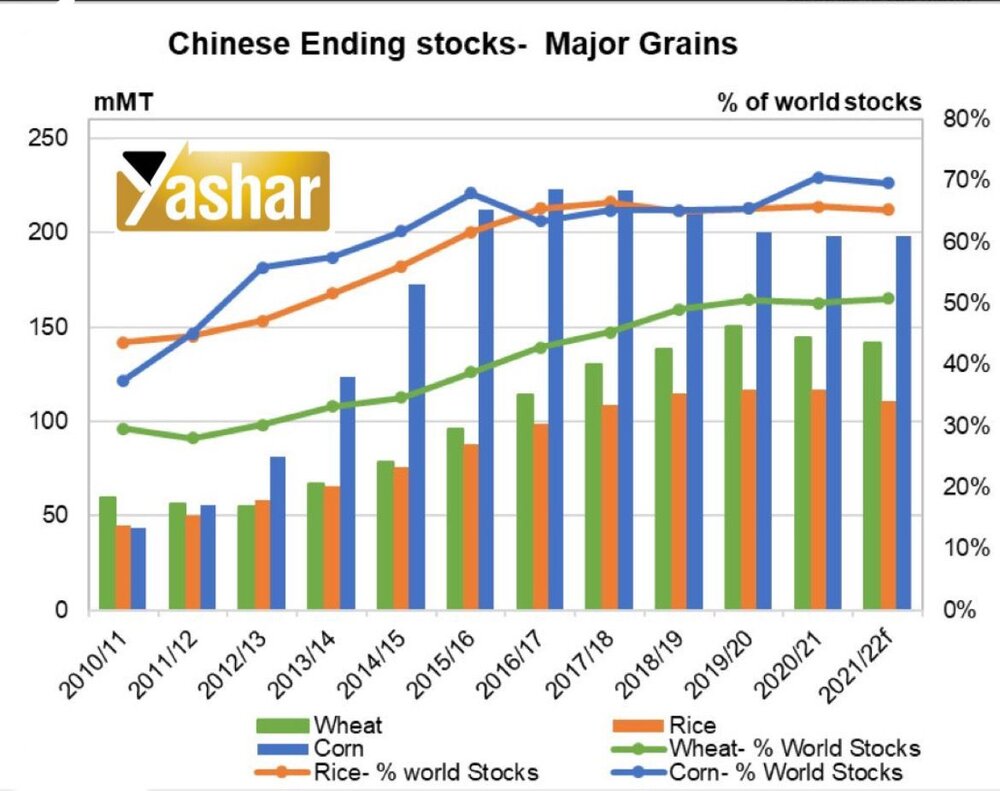 چین، تقریبا بیشترین ذخایر موجودی کالاهای اساسی در دنیا را دارد. از آغاز مساله همه گیری، به مرور زمان شاهد افزایش قیمت انواع کالاهای کشاورزی و به دنبال آن رشد شاخص قیمت مواد غذایی بودیم. محدودیت های ناشی از همه گیری و کمبود منابع انسانی و تاثیر مستقیم آن بر زنجیره تامین را از علل اصلی کاهش تامین و در مقابل افزایش تقاضای بازار و رشد قیمت ها را شاهد بودیم.