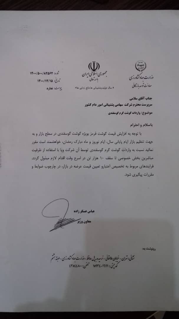 عباس عسکرزاده معاون توسعه بازرگانی وزارت جهاد کشاورزی در نامهای به محسن سلامی، مدیرعامل شرکت پشتیبانی امور دام خواستار واردات گوشت گرم گوسفندی تا سقف ١٠ هزار تن شد.