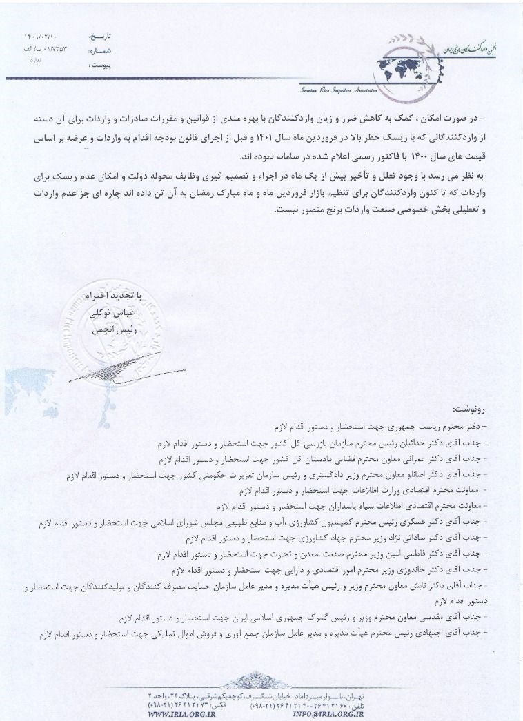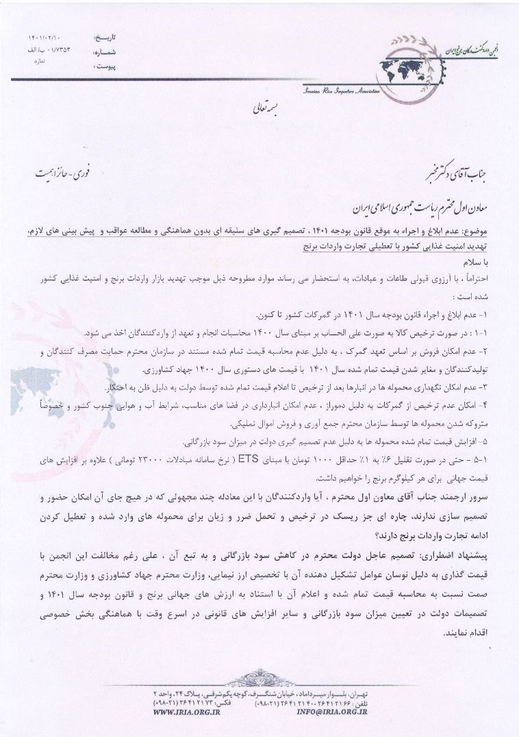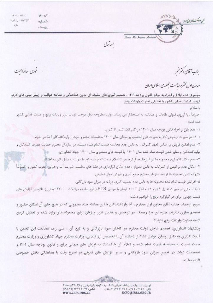 به گزارش پایگاه اطلاع رسانی کشاورزی ایران (اگنا)؛به نقل از تسنیم،عباس توکلی رئیس انجمن واردکنندگان برنج ایران با ارسال نامه ای به محمد مخبرمعاون اول ریاست جمهوری اسلامی ایران با موضوع: «عدم ابلاغ و اجراء به موقع قانون بودجه ۱۴۰۱ در مورد واردات برنج و تصمیم گیریهای سلیقه ای بدون هماهنگی» نوشت: