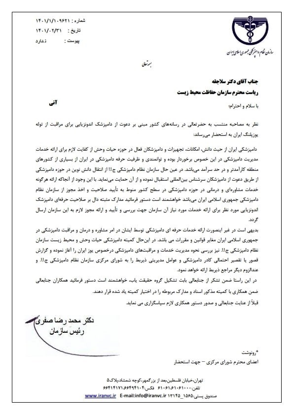 نظر به مصاحبه منتسب به حضرتعالی در رسانههای کشور مبنی بر دعوت از دامپزشک اندونزیایی برای مراقبت از توله یوزپلنگ ایران به استحضار میرساند: