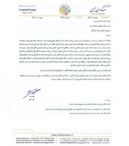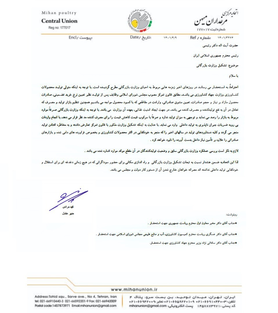 اتحادیه مرکزی مرغداران میهن طی نامه ای به رییس جمهور نسبت به تشکیل وزارت بازرگانی واکنش نشان داد. در متن این نامه آمده است: