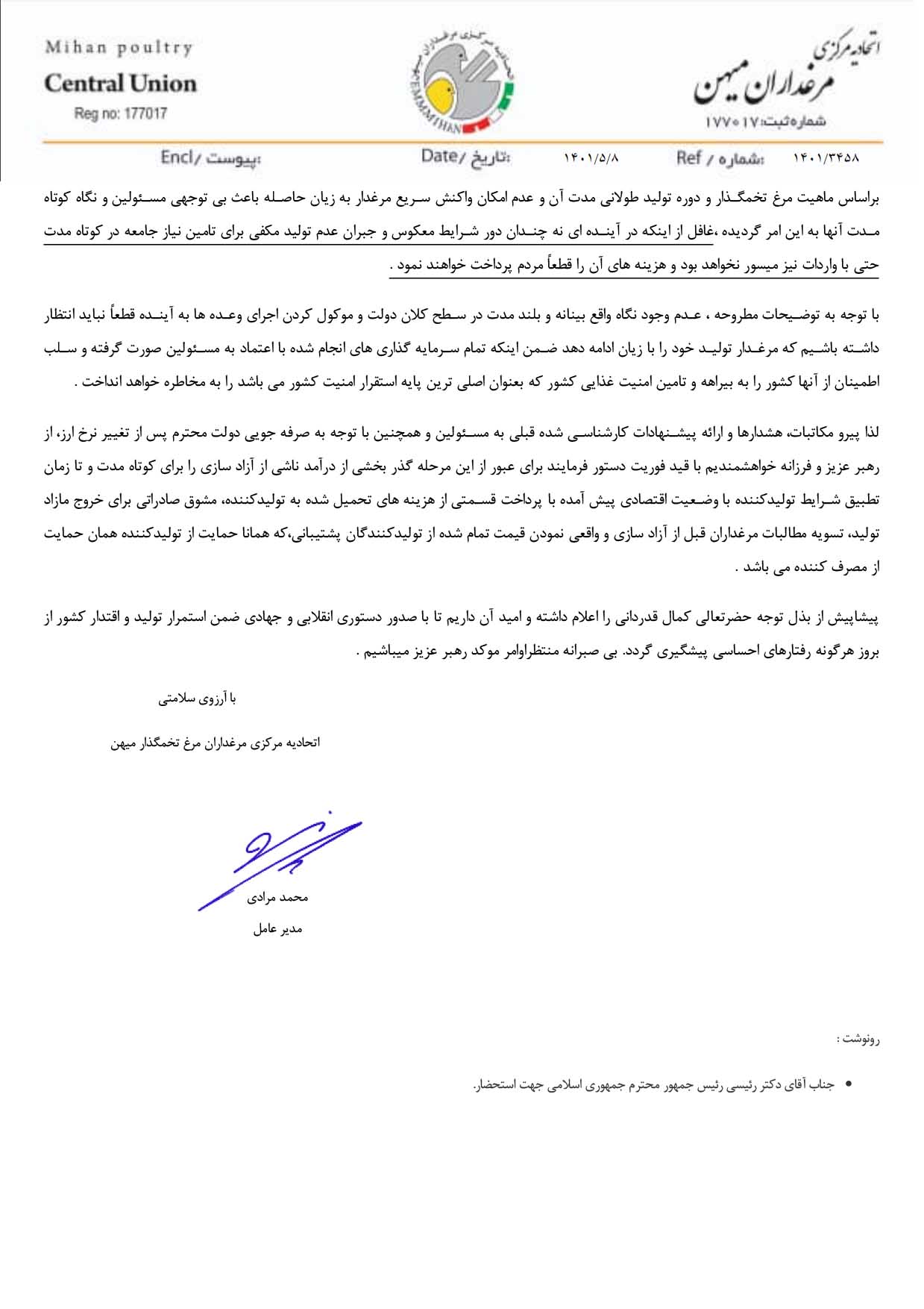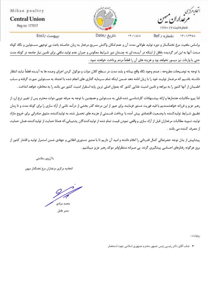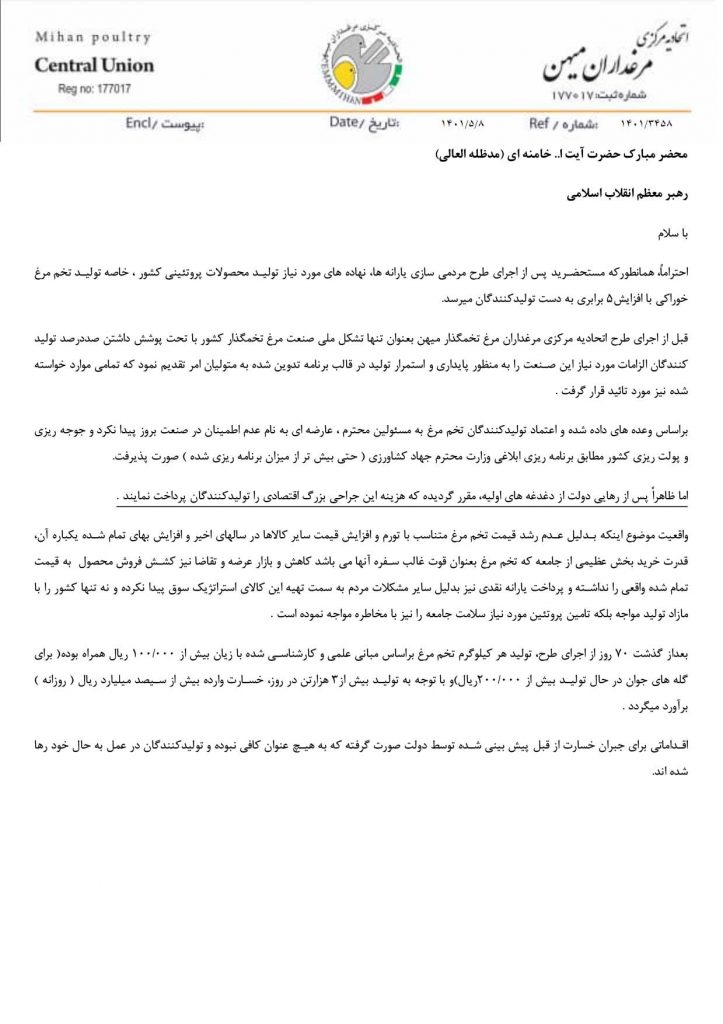 اتحادیه مرکزی مرغدارن میهن در نامه ای به مقام معظم رهبری از ایشان برای حل مشکلات مرغدارن و بازار تخم مرغ درخواست کمک کرد.