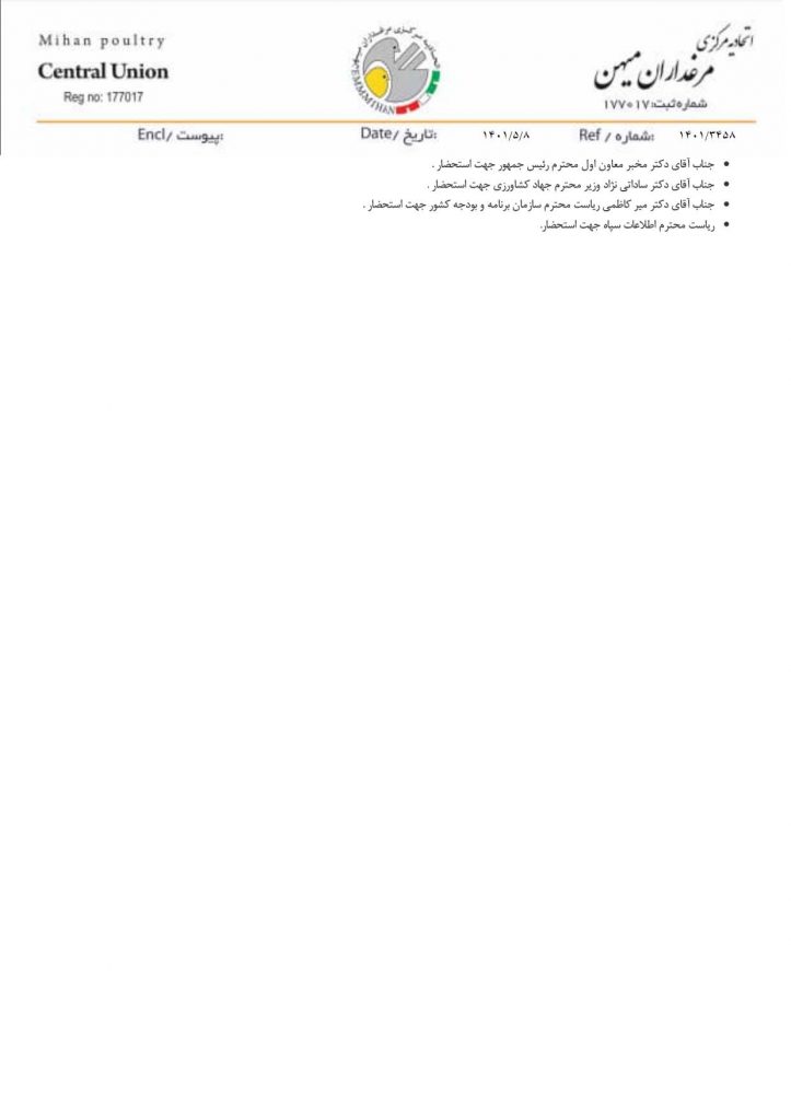 لذا پیرو مکاتبات، هشدارها و ارائه پیشنهادات کارشناسی شده قبلی به مسئولین و همچنین با توجه به صرفه جویی دولت محترم پس از تغییر نرخ ارز، از رهبر عزیز و فرزانه خواهشمندیم با قید فوریت دستور فرمایند برای عبور از این مرحله گذر بخشی از درآمد ناشی از آزاد سازی را برای کوتاه مدت و تا زمان تطبیق شرایط تولید کننده با وضعیت اقتصادی پیش آمده با پرداخت قسمتی از هزینه های تحمیل شده به تولیدکننده، مشوق صادراتی برای خروج مازاد تولید، تسویه مطالبات مرغداران قبل از آزاد سازی و واقعی نمودن قیمت تمام شده از تولیدکنندگان پشتیبانی، که همانا حمایت از تولیدکننده همان حمایت از مصرف کننده می باشد.