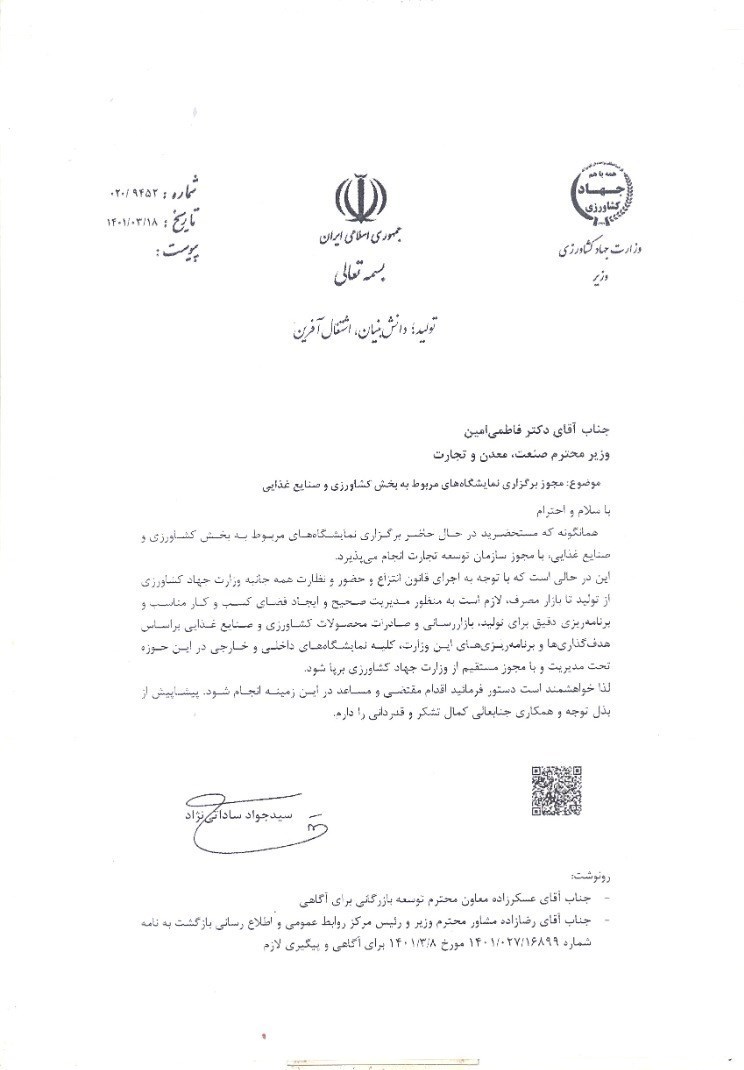 «همانگونه که مستحضرید در حال حاضر برگزاری نمایشگاه های مربوط به بخش کشاورزی و صنایع غذایی با مجوز سازمان توسعه تجارت انجام می پذیرد این در حالی است که با توجه به اجرای قانون انتزاع و حضور و نظارت همه جانبه وزارت جهاد کشاورزی از تولید تا مصرف، لازم است به منظور مدیریت صحیح و ایجاد فضای کسب و کار مناسب و برنامه ریزی دقیق برای تولید، بازار رسانی و صادرات محصولات کشاورزی و صنایع غذایی بر اساس هدف گذاری ها و برنامهریزیها این وزارت کلیه نمایشگاههای داخلی و خارجی در این حوزه تحت مدیریت و با مجوز مستقیم از وزارت جهاد کشاورزی برپا شود.