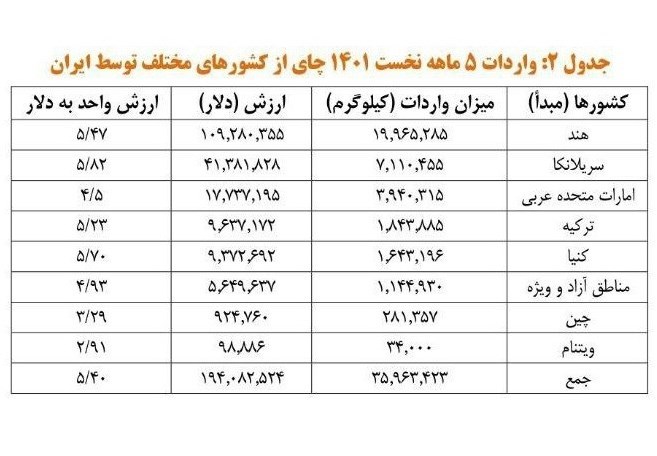 در ۵ ماه ابتدایی سال جاری حجم واردات چای به کشور ۴۲ درصد و صادرات ۷۷ درصد رشد کرده است اما با این وجود ارزش چای وارداتی در مقایسه با صادراتی بیش از ۹.۵ برابر است.