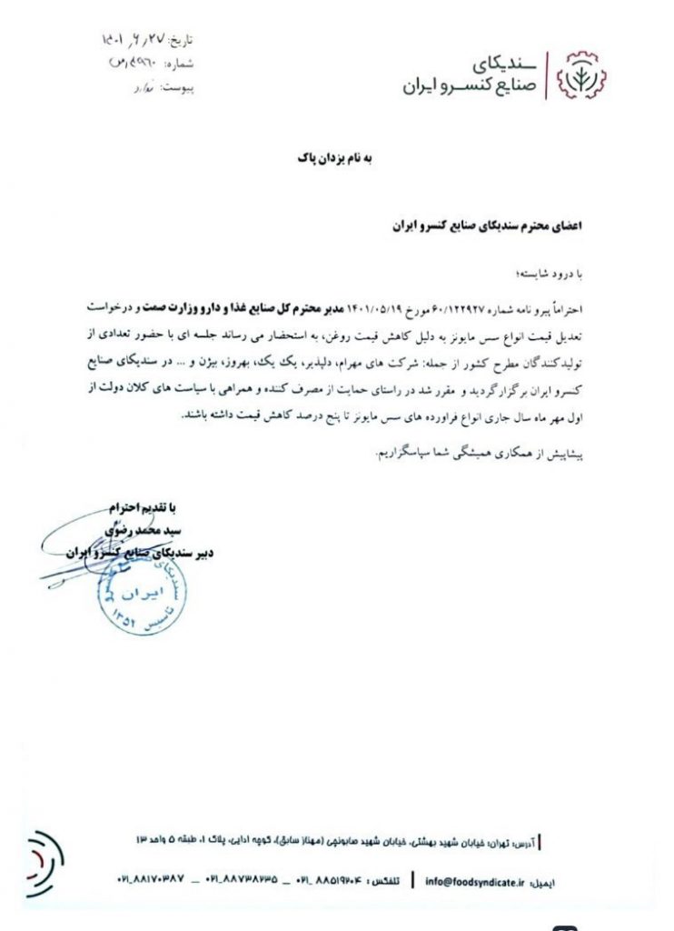 کاهش ۵ درصدی قیمت سس مایونز از اول مهر + سند