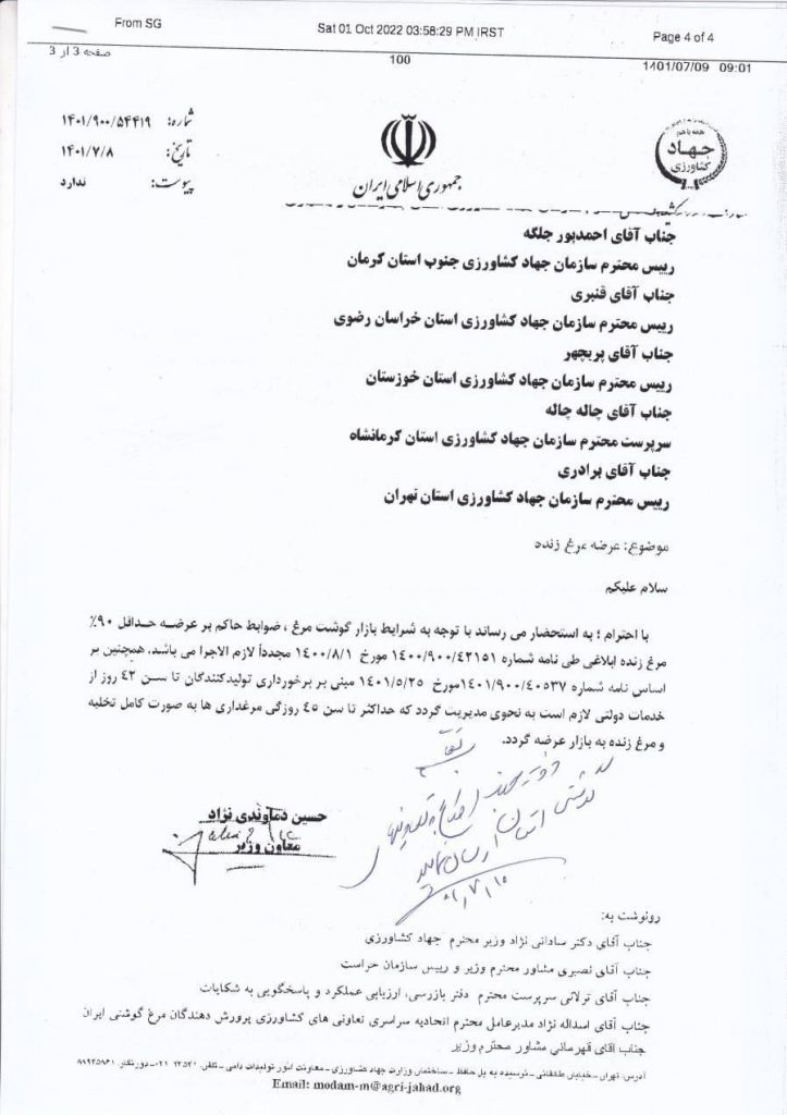 به گزارش پایگاه اطلاع رسانی کشاورزی ایران (اگنا)؛به نقل از تسنیم ، حسن دماوندی نژاد معاون وزیر جهاد کشاورزی با ارسال نامه ای به روسای جهاد کشاورزی برخی از استانها درباره عرضه مرغ زنده نوشت: با توجه به شرایط حاکم بر بازار گوشت مرغ و ضوابط حاکم بر عرضه حداقل ۹۰ درصد مرغ زنده ابلاغی لازم الاجرا است. همچنین باتوجه به برخوردای از خدمات دولت تا سن ۴۲ روزگی طیور گوشتی قابلیت استفاده دارد، لازم است به نحوی مدیریت صورت گیرد که این طیور حداکثر تا سن ۴۲ روزگی به صورت کامل از مرغداری های تخلیه و مرغ زنده در بازار عرضه شود.